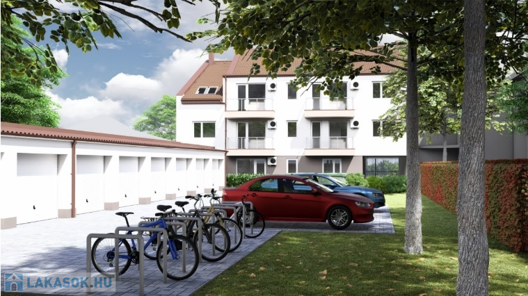 A lakás mellé külön megvásárolható garázs 9M Ft-ért vagy kocsibeálló 2,5M Ft-ért.