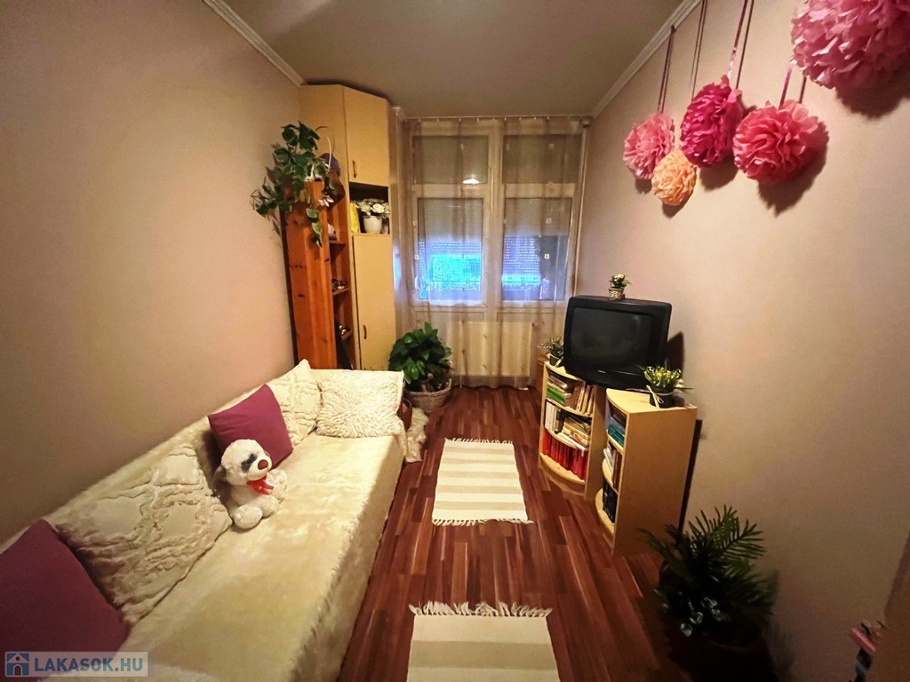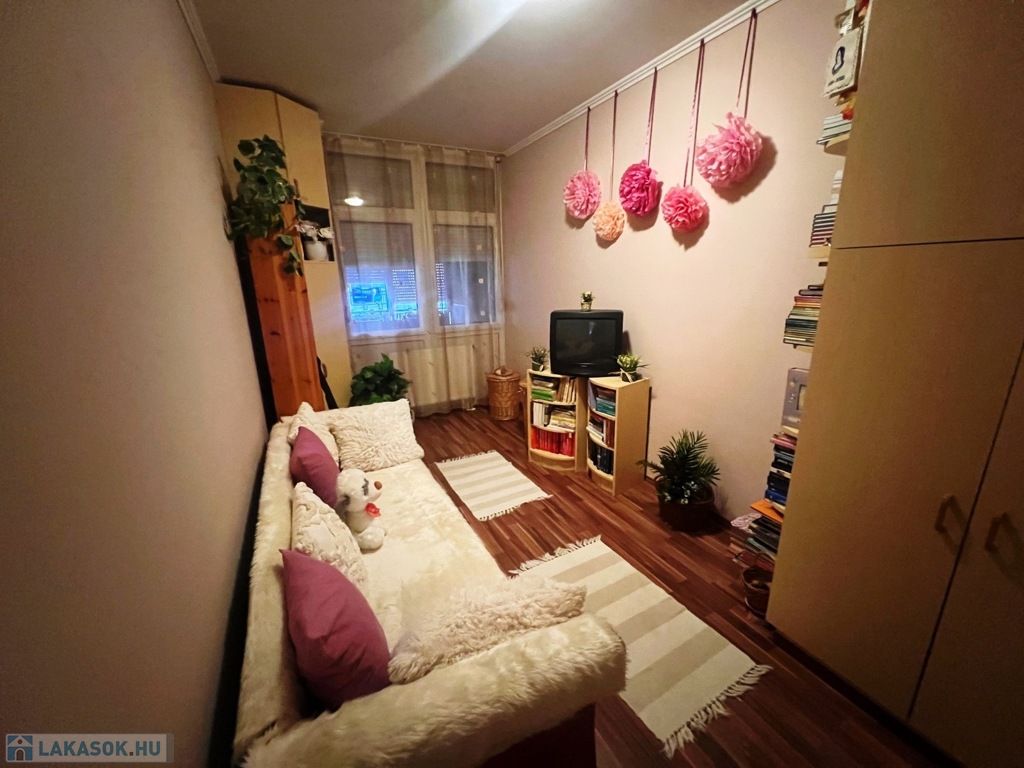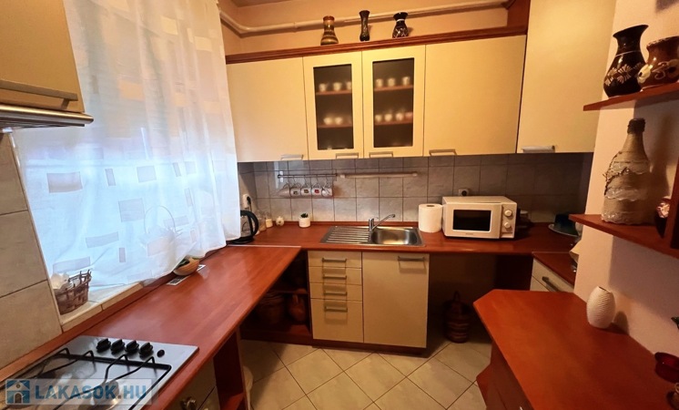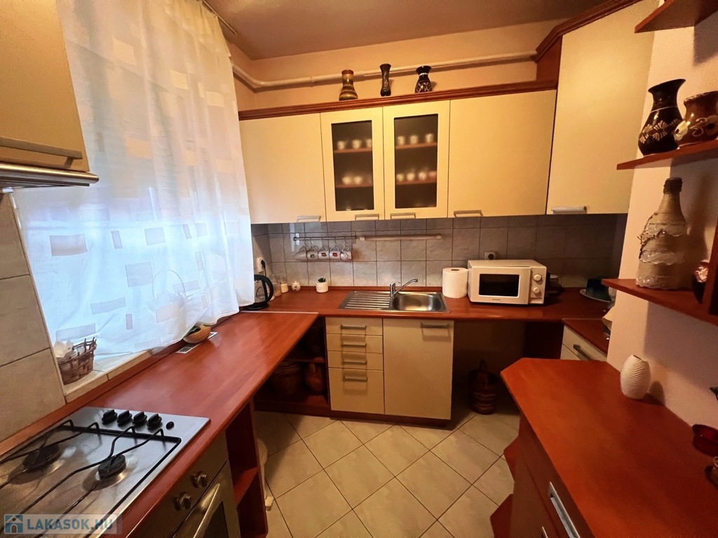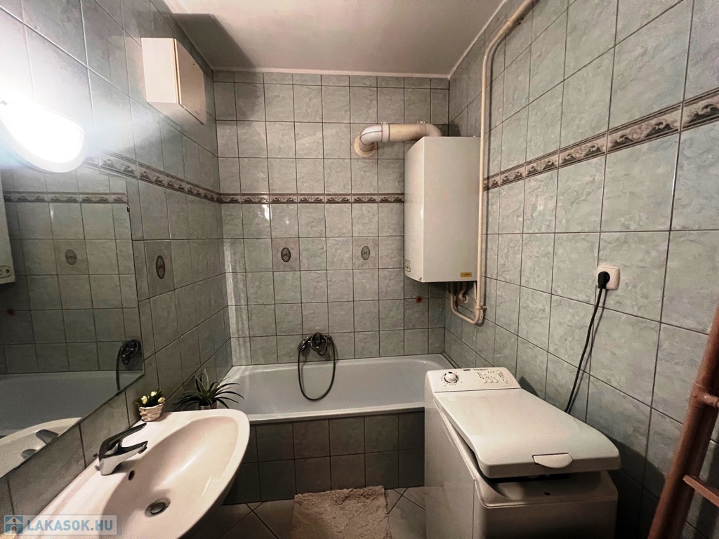 A lakás jó állapotú, műanyag nyílászárókkal és redőnyökkel felszerelt. A burkolatok járólap és laminált padló. A konyhában beépített konyhabútor található. A fürdőszoba és a WC külön helyiségben kapott helyet. A fűtést egyedi gázfűtés biztosítja.