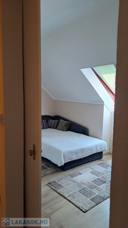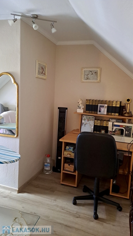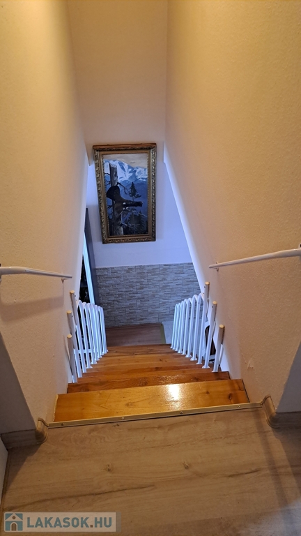 Alsó szint: nappali, 2 hálószoba, konyha + étkező, kamra, fürdőszoba (káddal és zuhanykabinnal), külön WC