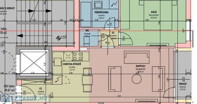 Az ingatlan praktikus elosztású, világos terekkel rendelkezik. A nappaliból közvetlen kijárat nyílik a 3,7 m²-es teraszra, amely kellemes kikapcsolódást biztosít.