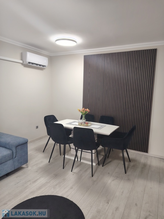 Klímás, műanyag nyílászárós redőnyös szúnyoghálóval.
