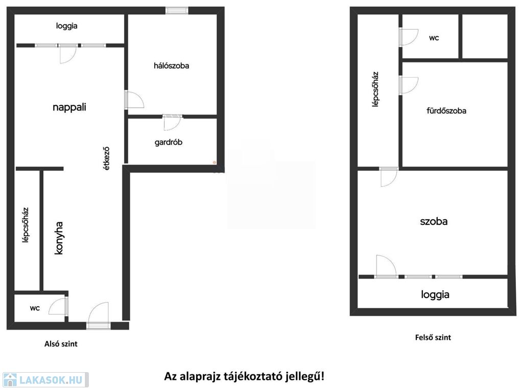 Alsó szinten: nappali - konyha - étkező erkéllyel, kamra, 1 szoba gardróbbal, wc