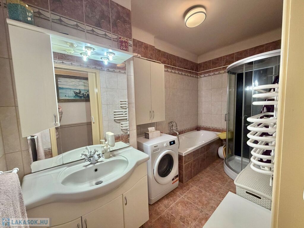 Az ingatlan tégla építésű társasház harmadik emeletén található, mért távfűtéses, klimatizált, műanyag nyílászárós, részben redőnnyel szerelve, laminált padló, járólap burkolatú, saját tároló, közös kerékpártároló tartozik hozzá.