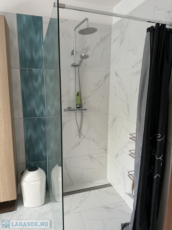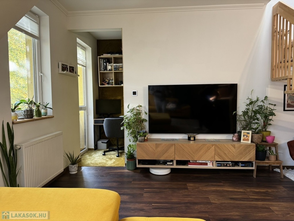 Az alsó szinten amerikai konyhás nappali található, egy külön nyíló szobával, tágas fürdőszobával, külön WC-vel, valamint egy praktikusan kialakított dolgozósarokkal. Az egyedi tervezésű, prémium minőségű belső lépcső nemcsak esztétikai elem, hanem a lakás karakterének egyik meghatározó része.