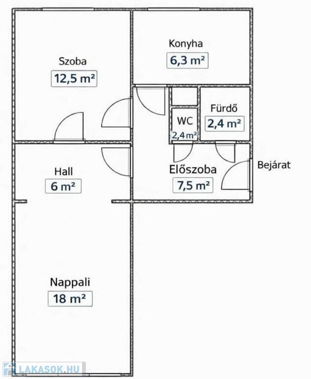 Elosztása praktikus és élhető: tágas nappali + hall (~24 m²) hálószoba (~12,5 m²) konyha (~ 6,3 m²) fürdő (~ 2,5 m²) WC (~ 1 m²) előszoba (~ 7,5 m²) Összesen: ~ 53 m²
