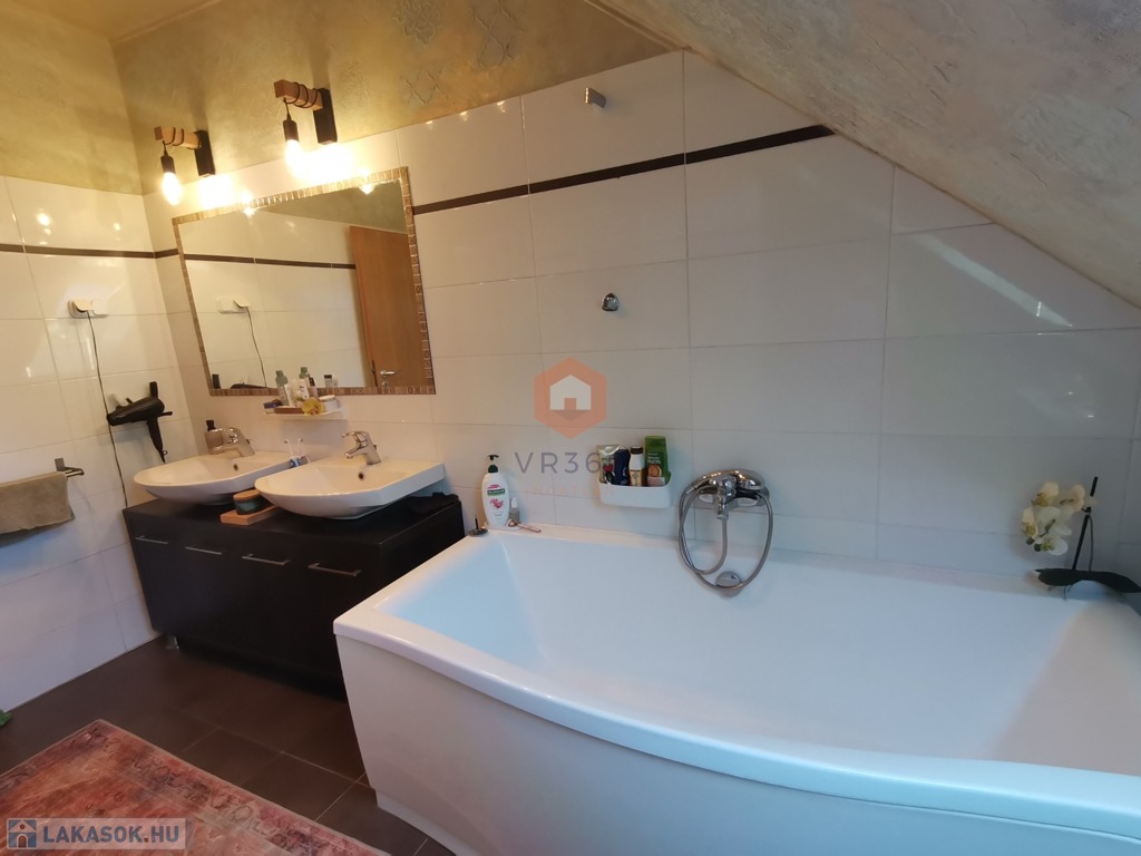 Egyedileg díszített emeleti fürdőszoba, káddal, WC-vel, az alsó szinten külön WC, tároló szoba a lépcső alatt.