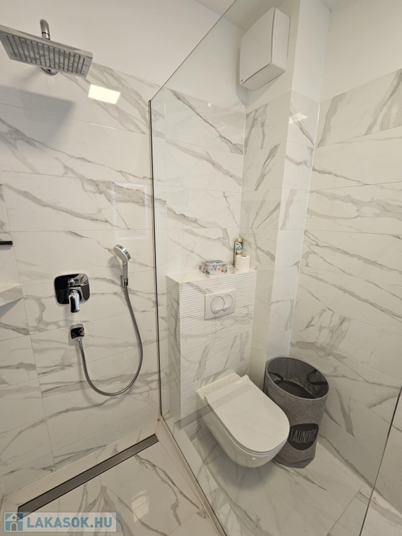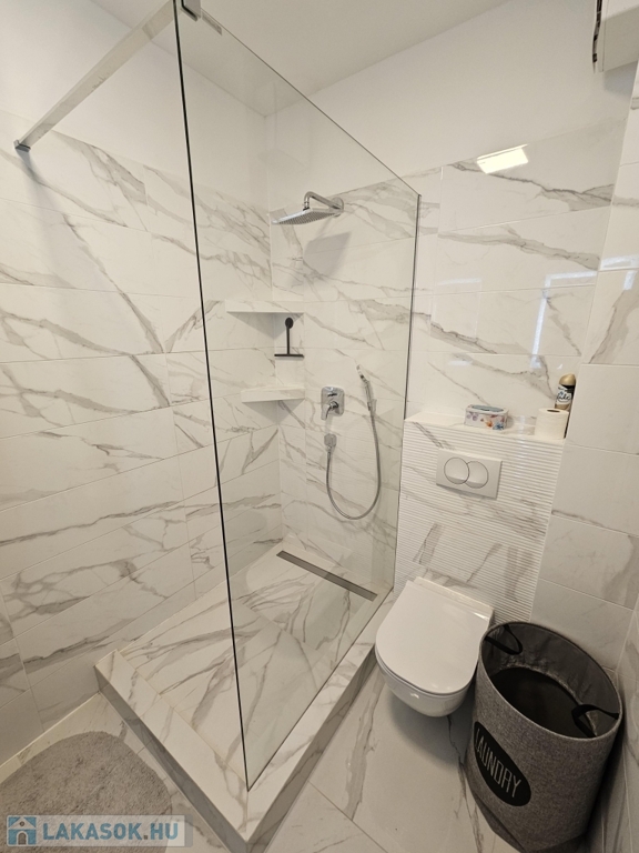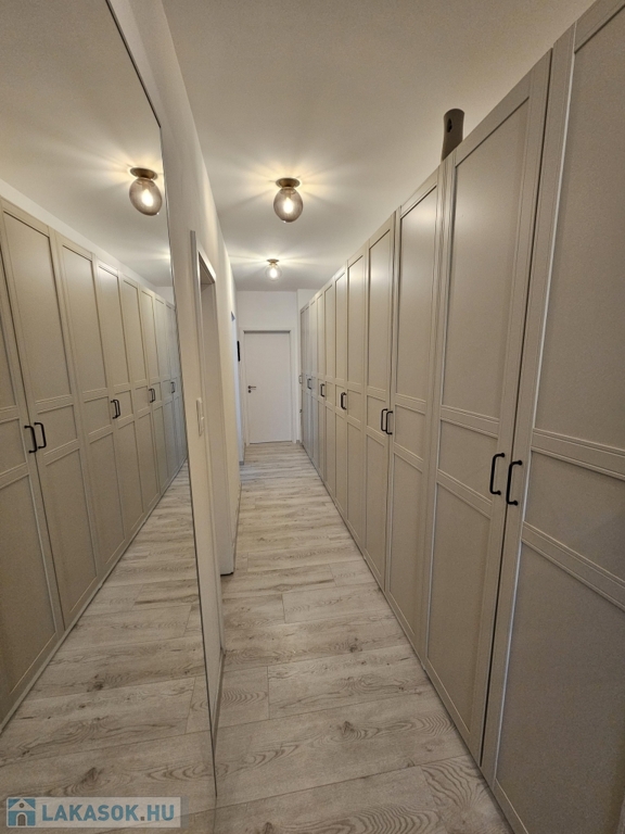 A lakáshoz tartozik egy 240 m²-es kizárólagos használatú, parkosított kert, benne egy könnyűszerkezetes, 10 m²-es kisházzal – ideális tárolónak vagy hobbihelyiségnek.