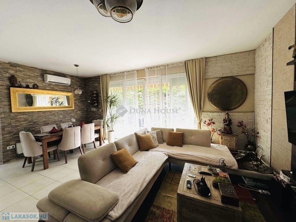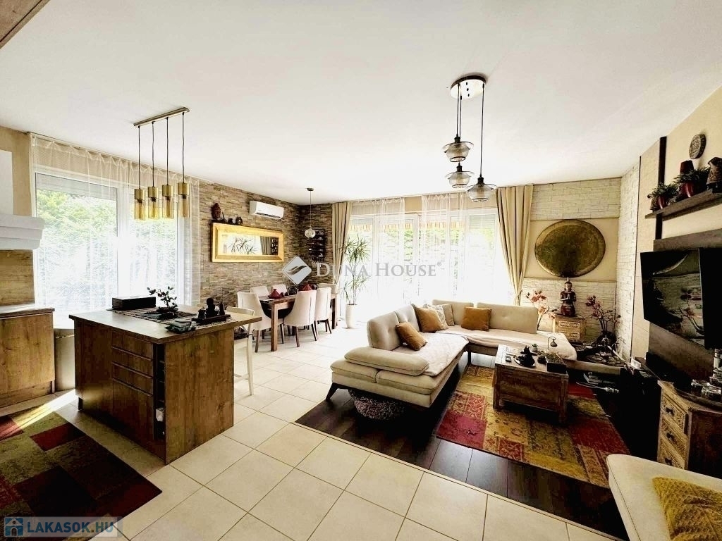 Toszkán életérzés itthon :medence, kerti tó, szauna ,varázslatos kilátás a Mecsekre.!!!!!!!!2008-ban épült, kiváló állapotú társasházi lakás .Ez a gyönyörűen felújított, egyedi stílusú, Amerikai konyha nappali, 2 szobás otthon tágas, amely ideális családi összejövetelekhez és baráti beszélgetésekhez.A lakásban vízlágyító berendezés működik, amely gázkazánra van kötve, így garantált a kényelmes és energiatakarékos használat.Egyedileg díszített emeleti fürdőszoba, káddal, WC-vel, az alsó szinten külön WC, tároló szoba a lépcső alatt.A szobák és a nappali is hűtő-fűtő klímával felszerelt, így a kellemes hőmérsékletet az egész lakásban érezni lehet.A mediterrán stílusú hátsó terasz igazi ékköve az ingatlannak: egy kis patak csordogál a kert végében, egy magasabb kert részben a medence, a grillezőhelyiség és a panorámás kilátás a Mecsekre pedig a nyugalom és a kikapcsolódás zálogai.A lakáshoz tartozik egy garázs (5.9M) elektromos kapunyitóval, a garázs mellett külön saját tároló, ahol a kazán és a vízlágyító berendezés is helyett kapott.Ha egy igazán különleges, jól karbantartott, pár hónapon belül költözhető ingatlant keres, akkor ezt látni kell!A jelenlegi tulajdonos kiváló lakberendezési ízlésének köszönhetően a lakás igazi különlegesség. A bútorok megegyezés tárgyát képezik.További kérdés esetén hívjon bizalommal