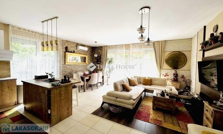 Toszkán életérzés itthon :medence, kerti tó, szauna ,varázslatos kilátás a Mecsekre.!!!!!!!!2008-ban épült, kiváló állapotú társasházi lakás .Ez a gyönyörűen felújított, egyedi stílusú, Amerikai konyha nappali, 2 szobás otthon tágas, amely ideális családi összejövetelekhez és baráti beszélgetésekhez.A lakásban vízlágyító berendezés működik, amely gázkazánra van kötve, így garantált a kényelmes és energiatakarékos használat.Egyedileg díszített emeleti fürdőszoba, káddal, WC-vel, az alsó szinten külön WC, tároló szoba a lépcső alatt.A szobák és a nappali is hűtő-fűtő klímával felszerelt, így a kellemes hőmérsékletet az egész lakásban érezni lehet.A mediterrán stílusú hátsó terasz igazi ékköve az ingatlannak: egy kis patak csordogál a kert végében, egy magasabb kert részben a medence, a grillezőhelyiség és a panorámás kilátás a Mecsekre pedig a nyugalom és a kikapcsolódás zálogai.A lakáshoz tartozik egy garázs (5.9M) elektromos kapunyitóval, a garázs mellett külön saját tároló, ahol a kazán és a vízlágyító berendezés is helyett kapott.Ha egy igazán különleges, jól karbantartott, pár hónapon belül költözhető ingatlant keres, akkor ezt látni kell!A jelenlegi tulajdonos kiváló lakberendezési ízlésének köszönhetően a lakás igazi különlegesség. A bútorok megegyezés tárgyát képezik.További kérdés esetén hívjon bizalommal