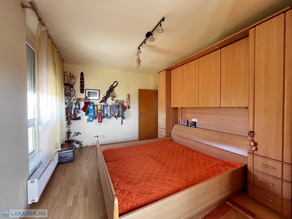 A lakás hasznos alapterülete 105 nm, a kert kb. 80 nm. A lakáshoz tartozik egy szabadtéri parkoló, valamint egy VALÓDI duplagarázs, ahova tényleg befér két nagyméretű autó, és még mindig marad benne hely.