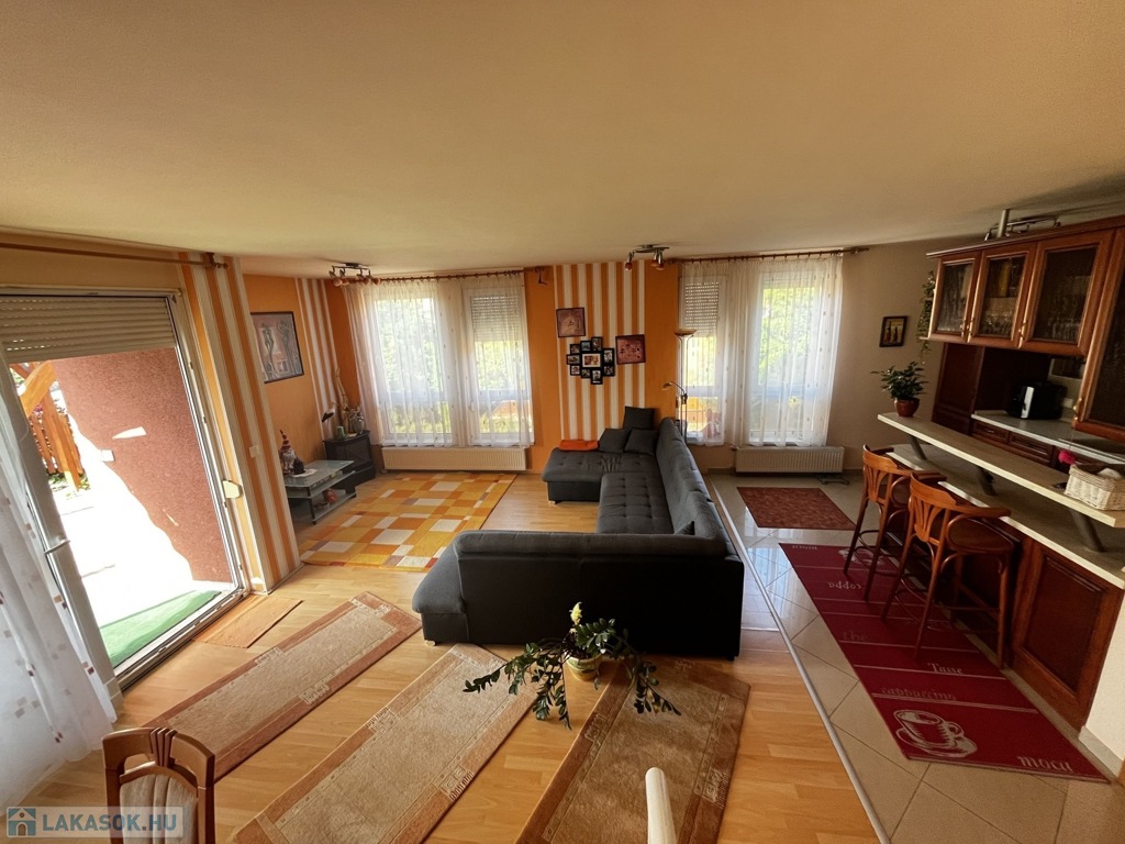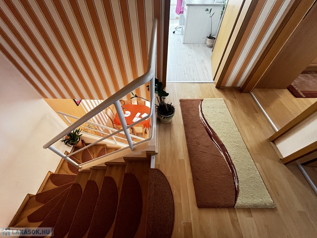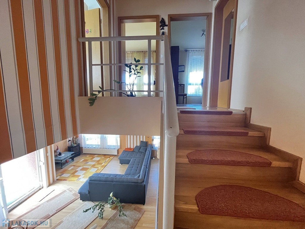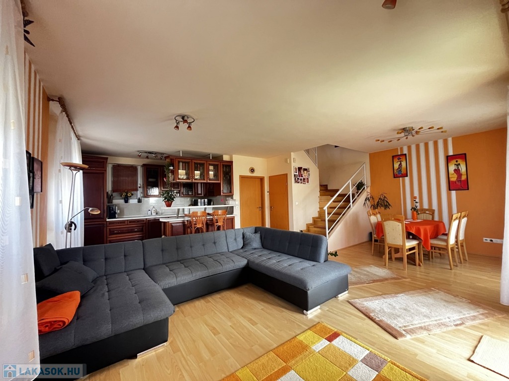 A lakás hasznos alapterülete 105 nm, a kert kb. 80 nm. A lakáshoz tartozik egy szabadtéri parkoló, valamint egy VALÓDI duplagarázs, ahova tényleg befér két nagyméretű autó, és még mindig marad benne hely.