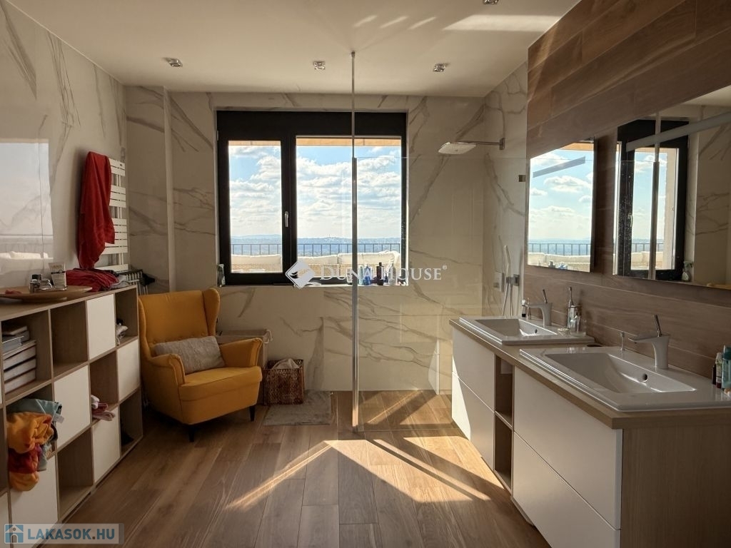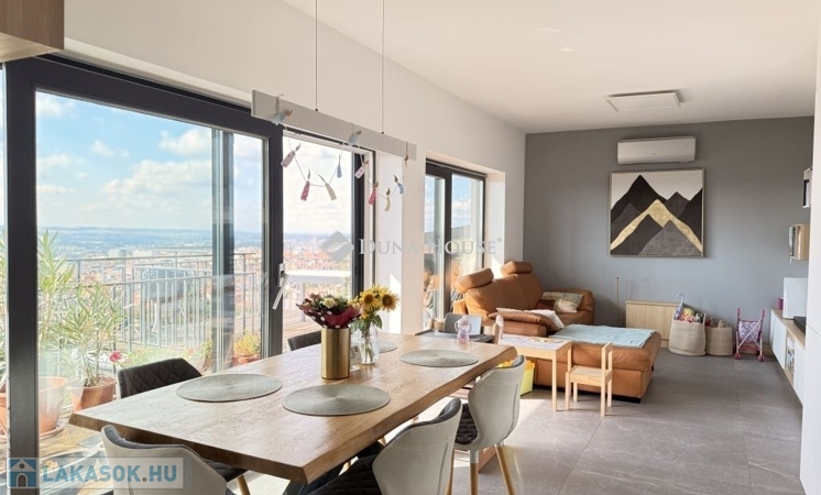 Pécs-Mecsekoldal jól megközelíthető részén, a Havihegyen eladó egy 2021-ben épült, ÖRÖKPANORÁMÁS, belső kétszintes, 80 m2 lakótérrel rendelkező, amerikai konyha nappali+ 2 hálószoba, fürdő-wc, vendég wc elosztású lakás dupla terasszal(+60m2), 4 m2-es tárolóval, 19m2-es teremgarázshellyel és akár a teljes berendezéssel együtt!A két lakásos társasház prémium minőségben került kivitelezésre, falai 30-as Porotherm klíma téglából épültek és 10 cm-es grafitos szigetelést kaptak. Fűtése kondenzációs kombi kazánról padlófűtéssel üzemeltethető és rendelkezésre áll szintenként egy-egy GREE 3,5kW-os hűtő fűtő klíma is.Extrák:- vízlágyító és víztisztító berendezés- elektromos redőnyök szúnyoghálóval- süllyesztett tolóajtó- Hörmann elektromos garázskapu- Servo-drive(önzáró) konyhabútor, beépített AEG gépekkel, borhűtő- magas minőségű burkolatok, egyedileg gyártott beépített bútorok, Villeroy & Boch szaniterek, Hansgrohe szerelvények- Szél&fényérzékelős automata napellenző- jakuzzi kiállás- riasztó előcsövezésAz ingatlan gyorsan költözhető!
