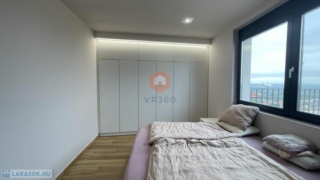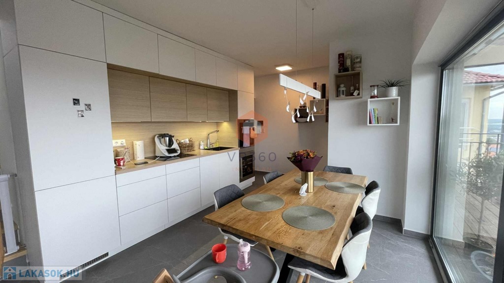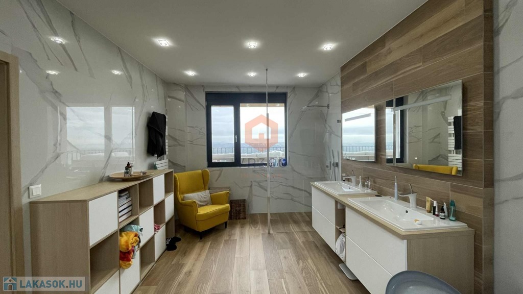80 m2 + 2 × 30 m2 déli fekvésű panorámás terasz, garázs: 18,5 m2, külön saját tároló: 4 m².