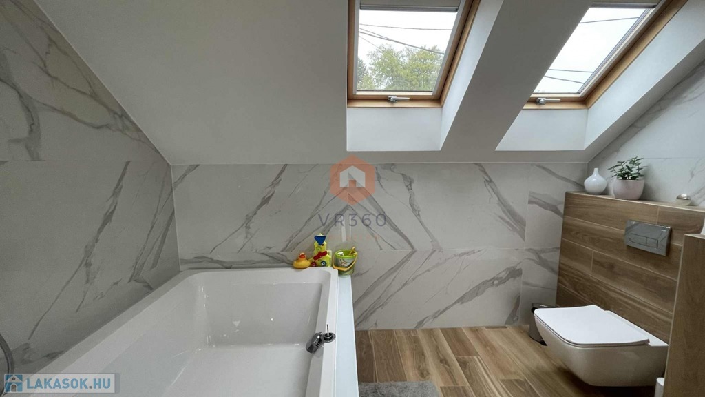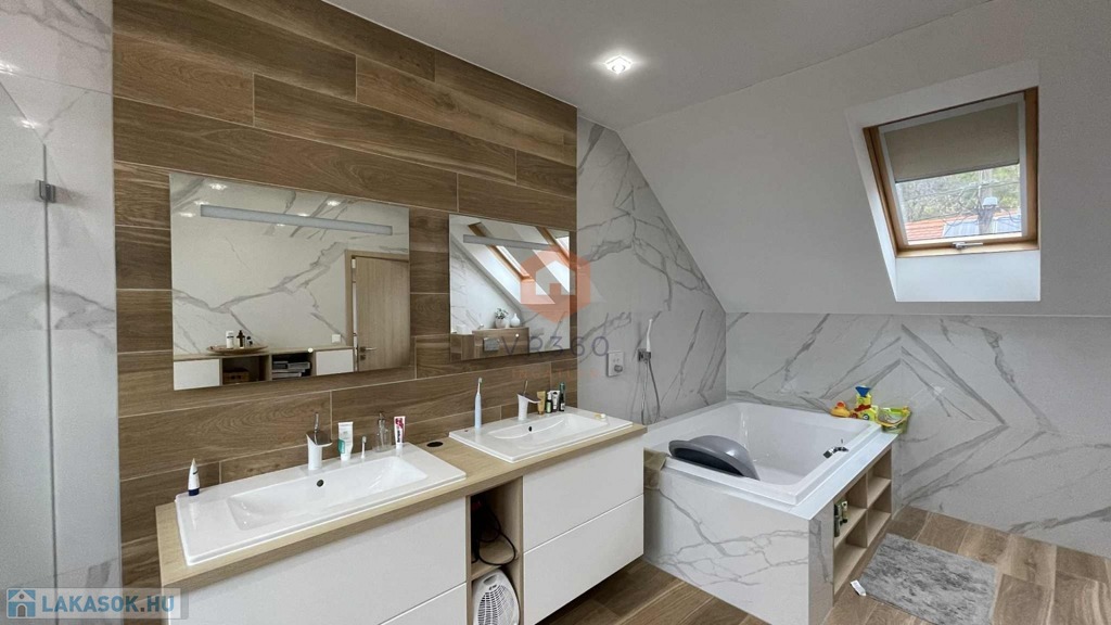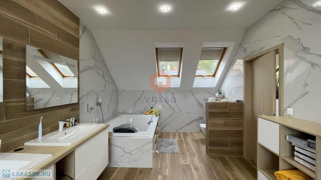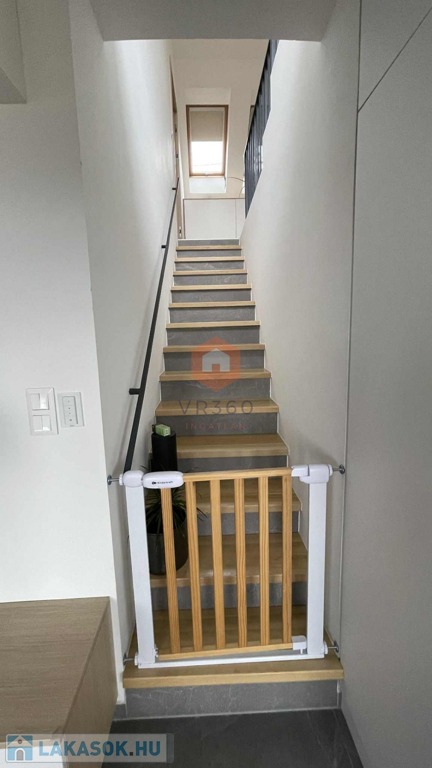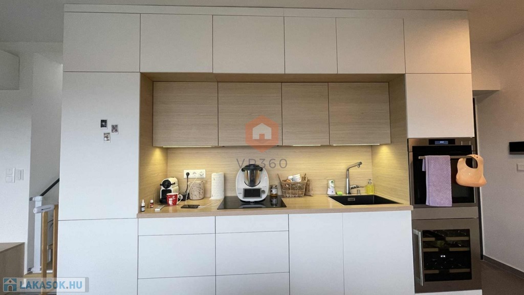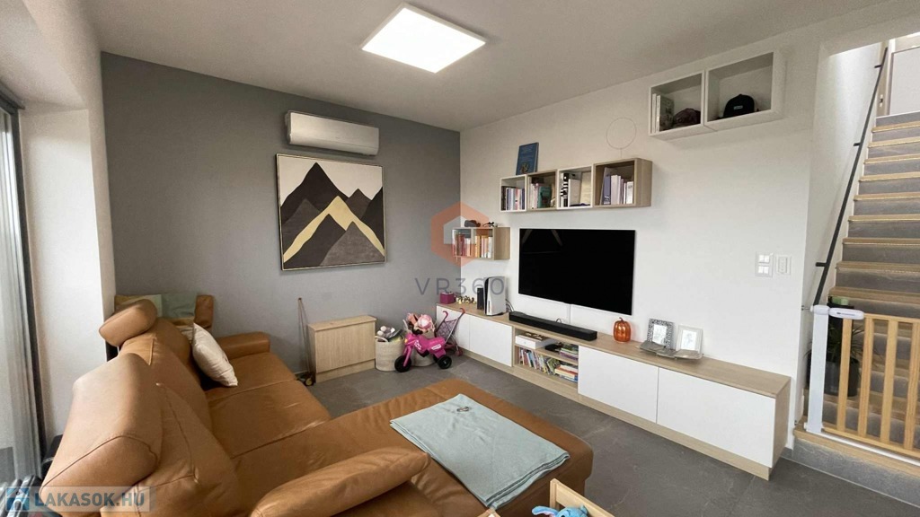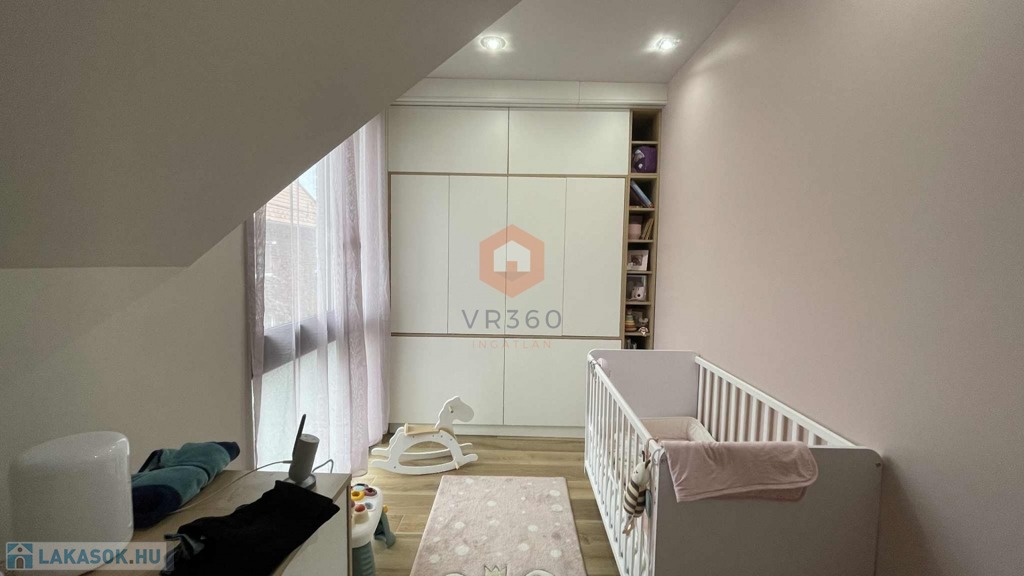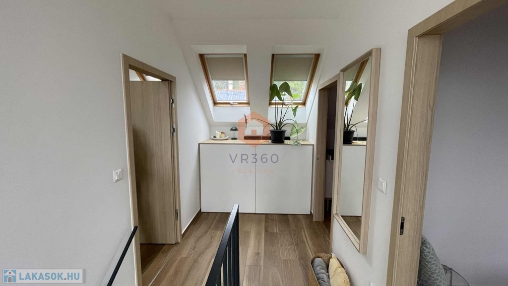 Felszereltség: padlófűtés kondenzációs gázkazánnal, BWT Aqa Perla Bio 50 vízlágyító, Gree U-Crown (alsó szint) és Gree Amber (felső szint) klímák, elektromos redőnyök és szúnyoghálók, szélérzékelős motoros árnyékoló a felső teraszon, féltető az alsón.