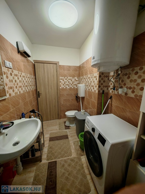 - A fürdőszobában modern burkolatok és szaniterek lettek beépítve