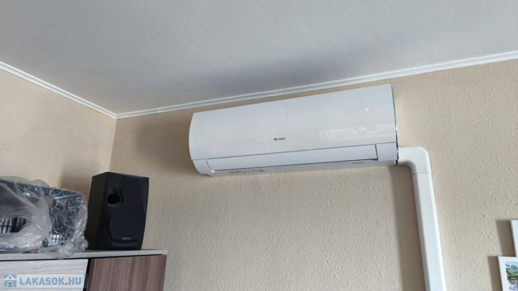 A keleti tájolású, nagy erkéllyel rendelkező szobában Split klíma biztosítja a nyári napokon a kellemes hőmérsékletet.
