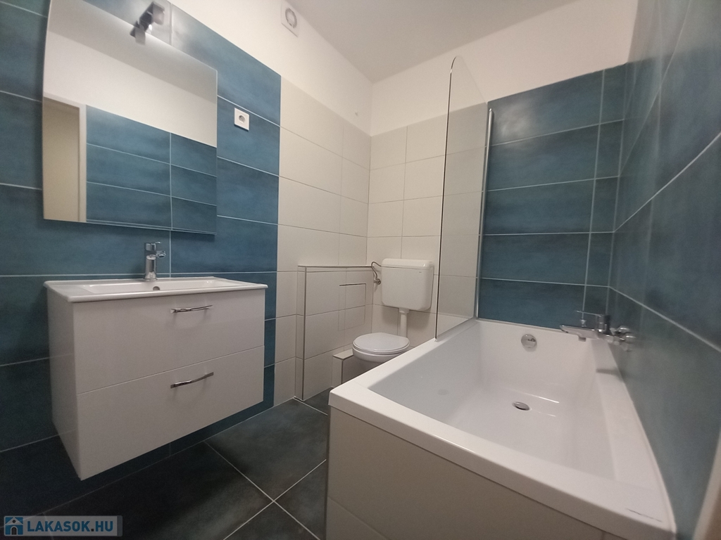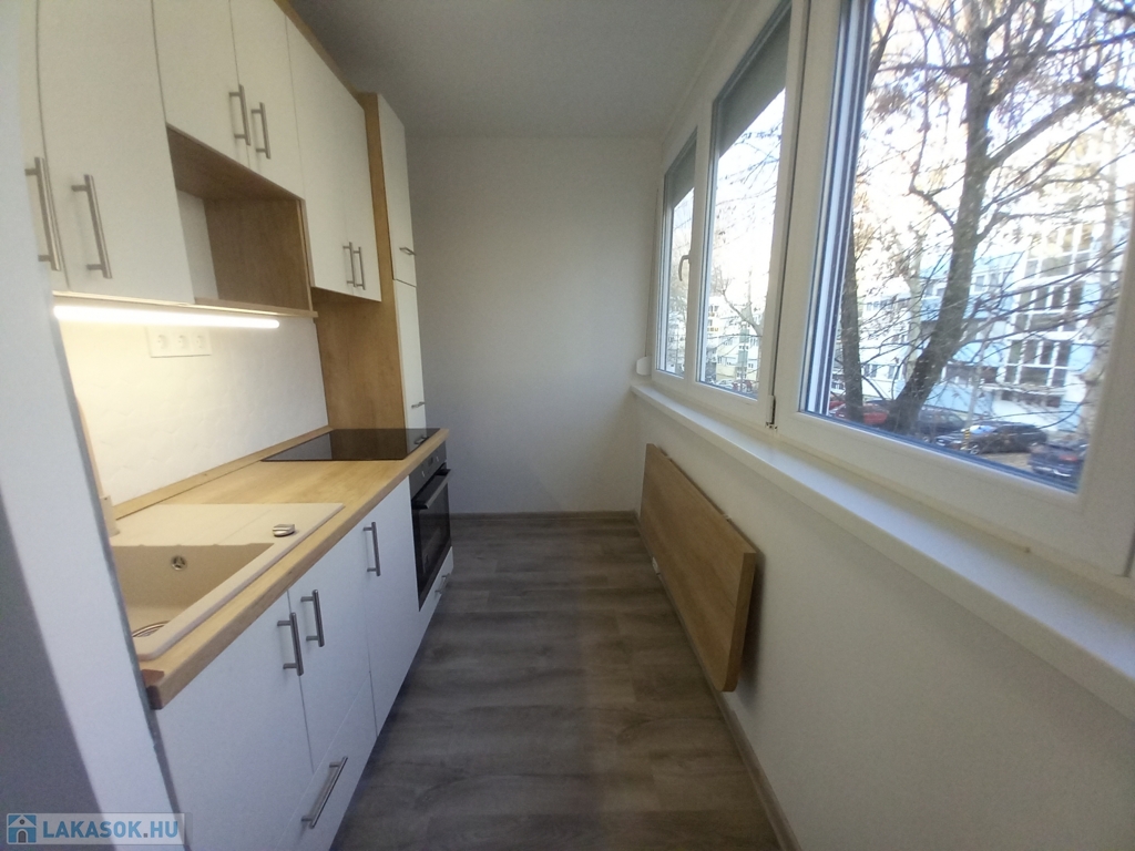 A modern fürdőszoba káddal felszerelt, amelyhez a praktikus használat érdekében zuhanyparaván is tartozik. A lakásban új, gépesített konyhabútor került beépítésre, amely tovább növeli az ingatlan komfortját és értékét.