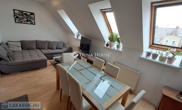Eladó Pécs belvárosában a Móricz Zsigmond téren egy jó állapotú, 65 m2-es, belső kétszintes, gázcirkó fűtésű, két hálós tetőtéri téglalakás.