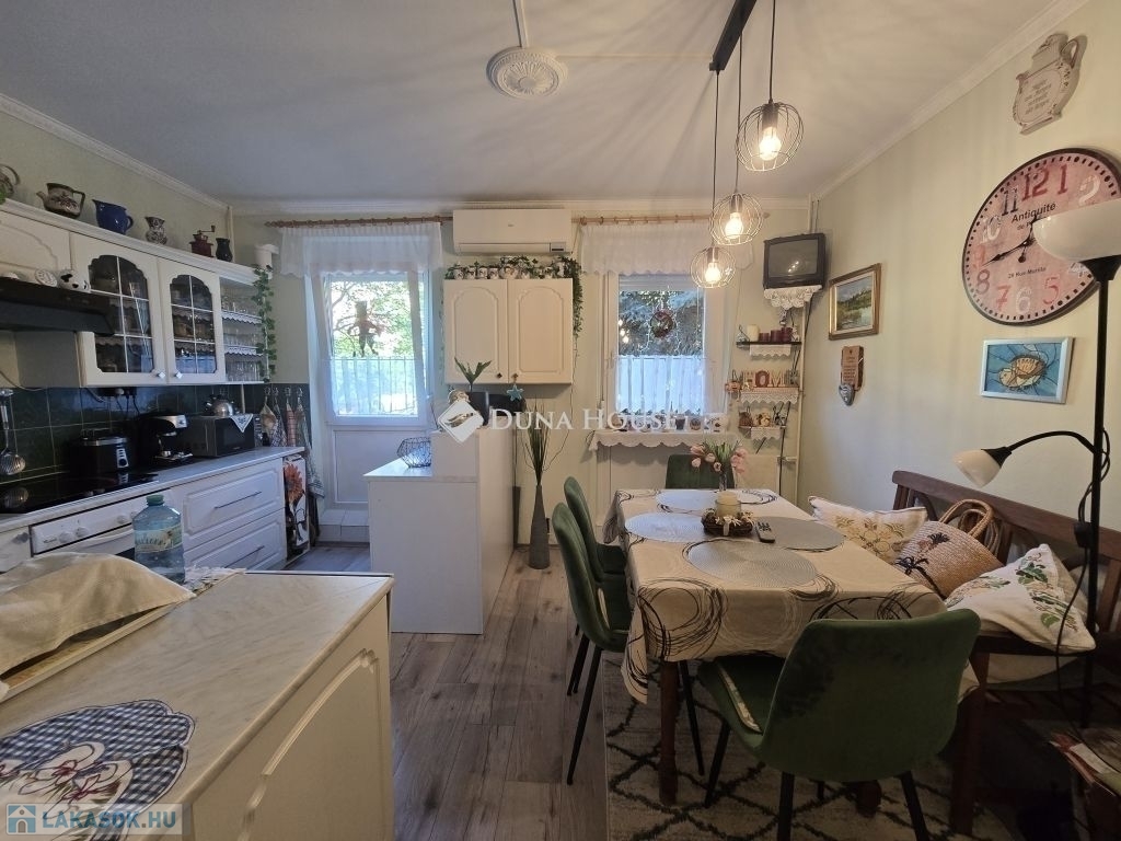 Eladó 74 m2-es, földszinti, kertkapcsolatos lakás kertvárosi környezetben!Eladásra kínálunk a Nagy Imre úton egy 74 m²-es, jó állapotú, földszinti lakást egy négyemeletes, szigetelt panelépületben. Az eredetileg 3,5 szobás elrendezés modern igényekre lett átalakítva: tágas konyha-étkező és három külön nyíló hálószoba várja új tulajdonosát.A lakáshoz tartozik egy különleges adottság: az önkormányzattal kötött használati megállapodás alapján egy kerítéssel körbevett zöld terület, virágos kert is a tulajdonos kényelmét szolgálja. A gondozott kertben hintaszék, kerti asztal és székek is helyet kaptak így a lakás valódi kertkapcsolatos otthon érzetét nyújtja.Főbb jellemzők:-műanyag nyílászárók (redőnnyel, szúnyoghálóval),-klímaberendezés,-részben cserélt beltéri ajtók,-rendezett, csendes lakóközösség,-nagy tároló ketten osztozva-kertkapcsolat-jó közlekedés, kertvárosi, nyugodt környezet.Az ingatlan tehermentes a kiköltözés picit hosszabb időt igényel. A lépcsőház tiszta ,rendezett a lakóközösség kiváló!Ez az ingatlan ideális választás családoknak vagy bárkinek, aki a kényelmes lakás előnyeit szeretné ötvözni a saját kert nyugalmával.További kérdéseivel és személyes megtekintésért várom hívását!