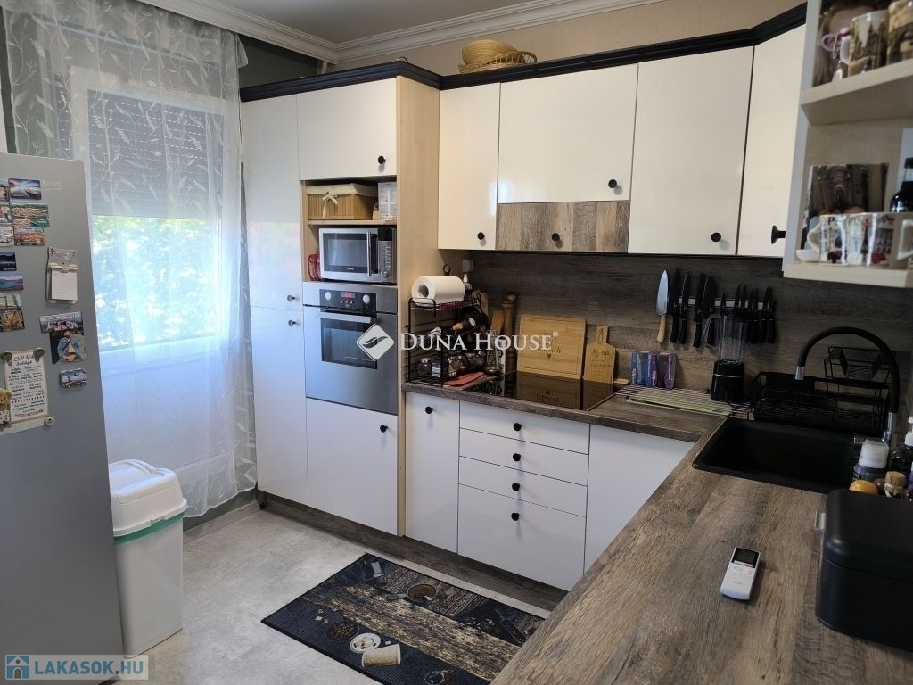 Eladó Pécsett-Rózsadombon a Fagyöngy u-ban egy 3. emeleti, 74nm-es, erkélyes, (3,5 szobás átalakított) 3 külön nyíló szobás panel lakás.A lakás teljesen felújított észak-déli tájolású.A konyha és a félszoba közötti válaszfal bontását követően egy nagy, 16 m2- es konyha - étkező lett kialakítva, modern bútorral, indukciós főzőlap + sütő és mosogatógép is van.Az épület szigetelt, műanyag nyílászárókkal ellátott. Fűtése távfűtés költségmegosztóval. Elrendezése kiváló nagy előszoba beépített szekrénnyel. A fürdő teljes körű felújításon esett át a megszokott egy csaptelep mellé beépítésre került egy kádtöltő zuhany váltós csaptelep is. Műanyag bejárati ajtó lett beépítve valamint a beltéri ajtók is cserélve lettek. A folyosón a konyhában étkezőben vinyl padló van. Szobában az eredeti laminált padlóra padlószőnyeg került. Minden ablakon redőny és szúnyogháló van. Az erkély tavasszal lett felújítva. Új szúnyoghálós redőny és padlóburkolat került ide is. Minden szobába és az étkezőbe tavasszal prémium kategóriás huzatmentes klíma lett telepítve.Az alagsorban van egy 2 lakás által használt nagy tároló is.Az ingatlan közelében buszmegálló (50m), bolt, posta, iskola, óvoda, orvosi rendelő, gyógyszertár található. A berendezési tárgyak alku tárgyát képezik.Amennyiben felkeltette érdeklődését, keressen bizalommal!