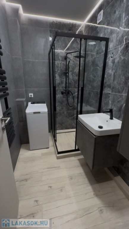 Exkluzív fürdőszoba: Prémium burkolatokkal, hangulatos világítással és magas minőségű szaniterekkel felszerelt helyiség.