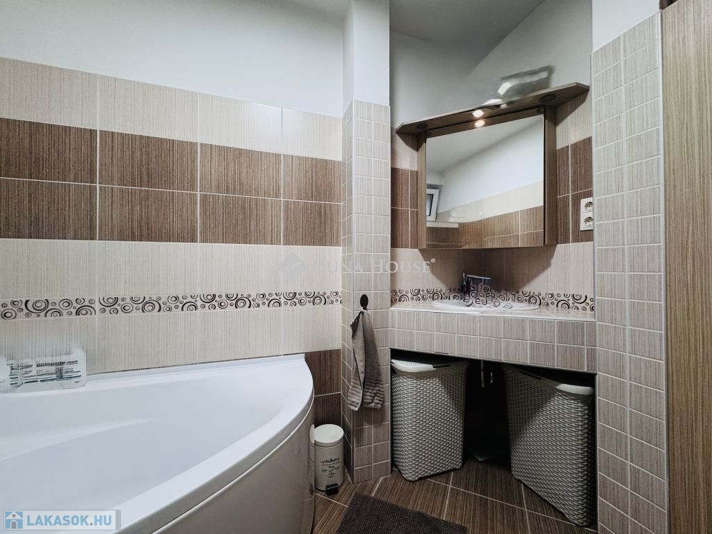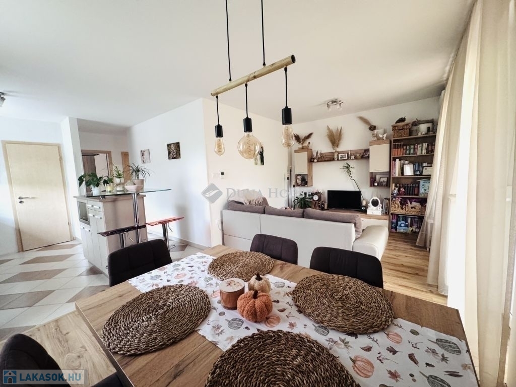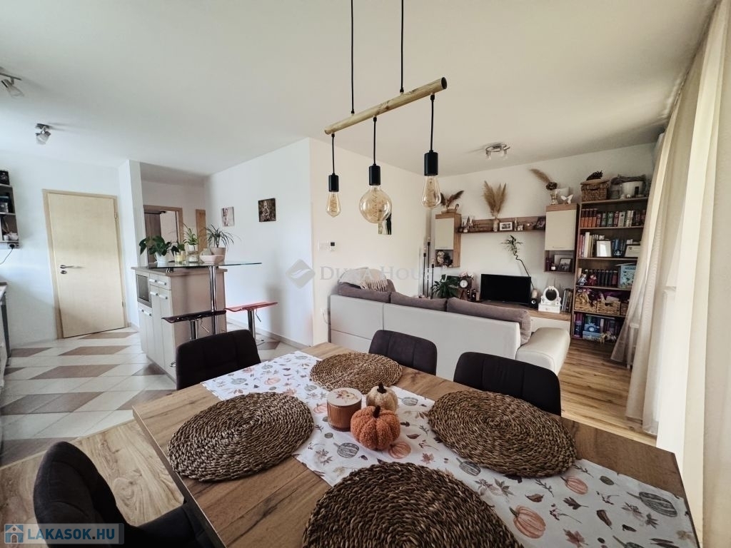 Eladó modern földszinti lakás nagy fedett terasszal és kertkapcsolattal Pécs, Rigóderi városrészPécs egyik kedvelt, csendes részén, a Rigóderi városrészben eladóvá vált egy 2008-ban épült, rendezett társasházföldszinti, fiatalosan berendezett, modern lakása.Az ingatlan amerikai konyhás nappaliból, két kényelmes hálószobából, külön fürdőből és WC-ből áll. A lakáshoz tartozik egy nagyméretű, fedett terasz, valamint egy kis, saját kertkapcsolat, ami tökéletes helyszín a pihenésre vagy baráti összejövetelekre.A lakás világos, jól szellőző, ízlésesen kialakított, azonnal költözhető állapotban van. A fűtés egyedi gázkazánnal történik, így a rezsi rendkívül kedvező. Emellett klíma is beszerelésre került, ami nyáron kényelmes hőmérsékletet biztosít. A lakóközösség barátságos és összetartó, a ház pedig csendes, rendezett környezetben található.A vételár tartalmaz egy saját udvari gépkocsibeállót, valamint a ház előtt további parkolási lehetőség is biztosított.Főbb jellemzők:2008-as építés, modern társasházFöldszinti, fedett teraszos, kertkapcsolatos lakás2 hálószoba + amerikai konyhás nappaliKülön fürdő és WCEgyedi gázfűtés, kedvező rezsiKlímával felszereltSaját parkoló + utcai parkolási lehetőségCsendes környezet, jó lakóközösségIdeális választás fiatal pároknak, kisgyermekes családoknak, vagy akár befektetésre is kiváló lehetőség.