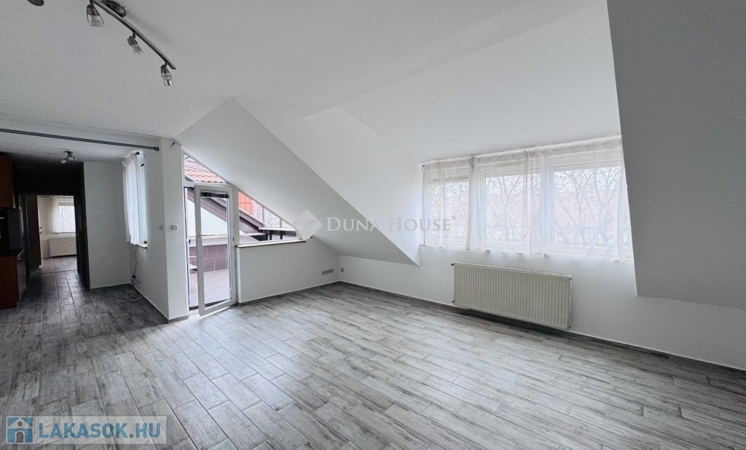 Eladó tetőtéri lakás Pécs közkedvelt Uránváros városrészében!Pécs egyik legkedveltebb, zöldövezeti részén, Uránvárosban eladóvá vált egy 1990-ben épült, kiváló állapotú, egyedi gázfűtéses tetőtéri lakás. Az ingatlan elrendezése és tágas tereinek köszönhetően ideális választás akár családok számára is.A lakás nettó alapterülete jól átgondolt elrendezésű:két különnyíló hálószoba,egy tágas, világos nappali,külön konyha és étkező,fürdőszoba és külön WC,kamra,dolgozósarok a gardrób részeként.A lakáshoz tartozik egy kb. 15 m²-es nagyméretű terasz, amely kiváló helyszínt biztosít pihenésre vagy baráti összejövetelekre.A lakás fenntartási költsége rendkívül kedvező, a fűtést és meleg vizet egyedi gázkazán biztosítja.A minőségi konyhabútor és beépített konyhai gépek a vételár részét képezik, ahogy a jelenlegi bútorzat is megegyezés tárgyát képezi.Az ingatlanhoz saját tároló is tartozik, a ház pedig rendezett, zöldövezeti környezetben található, jó szomszédsággal és kiváló infrastruktúrával: boltok, iskola, óvoda, buszmegálló néhány perces sétával elérhető.