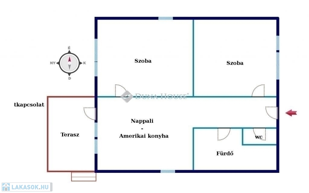 amerikai konyhás nappali, valamint két külön nyíló szoba biztosítja a kényelmes mindennapokat. A külön fürdőszoba és WC praktikus megoldást nyújt a család számára.
