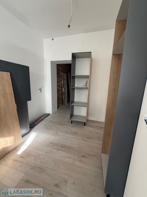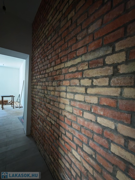 Különlegessége a folyosó teljes fala briliánsan kilátszó téglás, ami egyedi karaktert kölcsönöz a lakásnak.