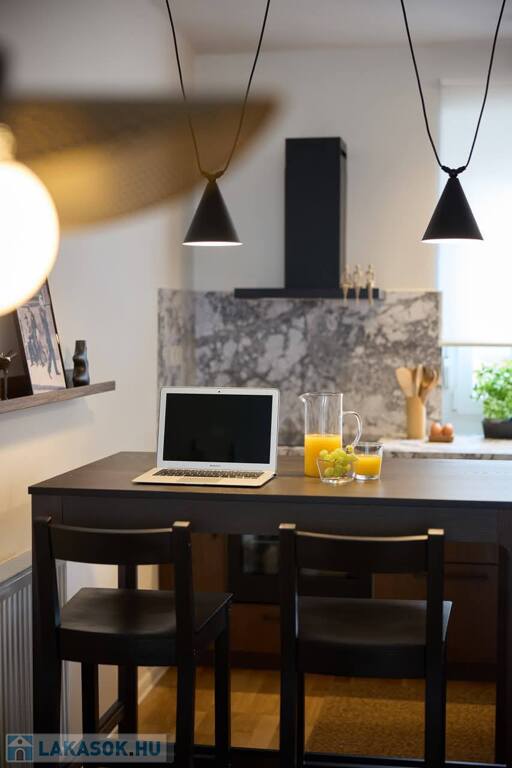 -amerikai konyhás tágas, napfényes nappali, konyhapult teljesen gépesített, indukciós főzőlappal, sütő, mikrohullámú sütő, páraelszívó, hűtő, mosogatógép, kombinált mosó-szárítógép