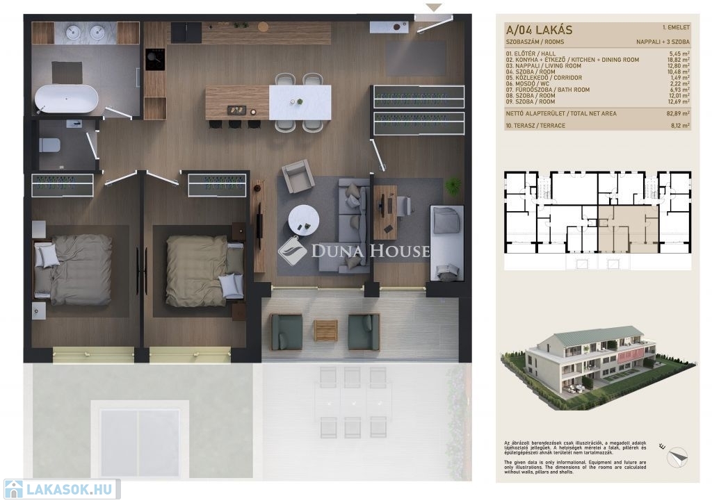 Az ingatlanban 48-119 nm közötti méretekben, a 1 szoba+nappalistól a 4 háló+nappalis elosztásig választhatunk, mindegyik lakáshoz saját tágas terasz is tartozik. A 2. emeleten 70 nm-es terasszal rendelkező PENTHOUSE LAKÁSOK kerülnek kialakításra, melyek igény szerint megoszthatók. A lakások minőségi burkolatai-szaniterei jelenleg egyedi igények szerint válaszhatók! Lehetőség van 22db teremgarázshely megvásárlására is nettó 8 M Ft/db áron!