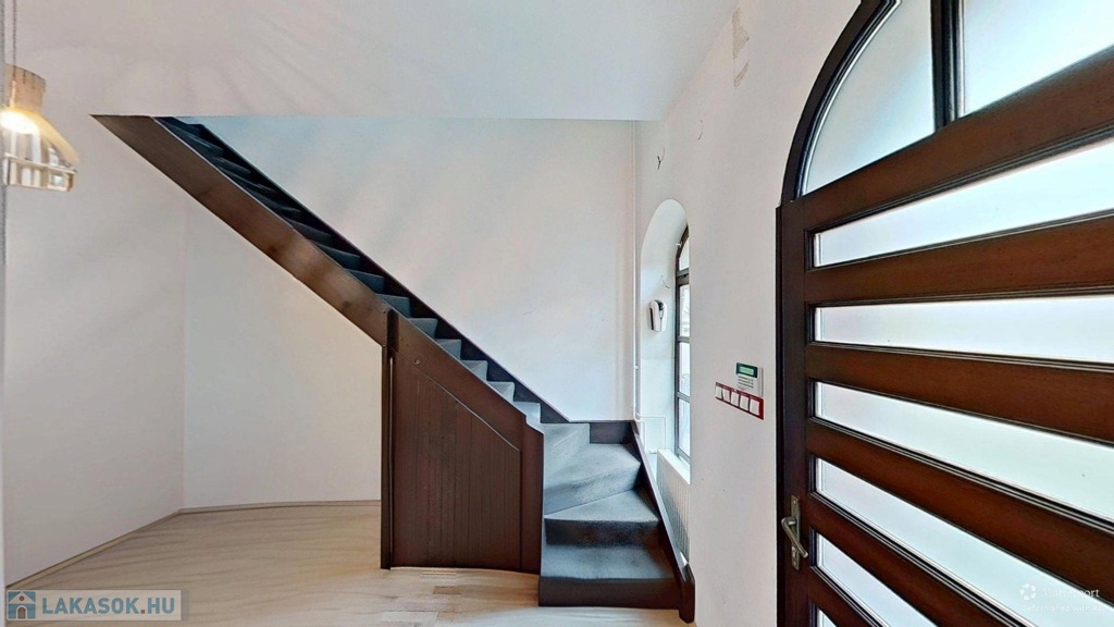 Az ingatlan főbejáratán egy tágas előtérben találjuk magunkat (ez akár váróként is hasznosítható, ha arra szükség lenne). Innen nyílik a földszinti lakrész, valamint egy lépcsőn innen lehet felmenni a felső lakrészbe.