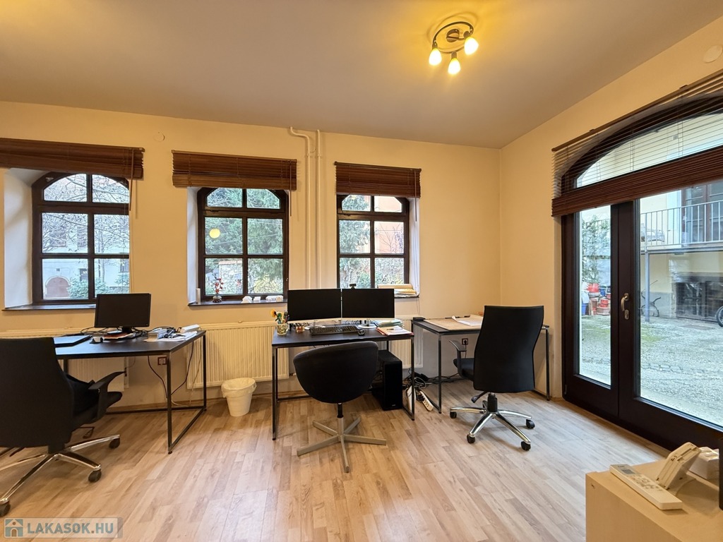 Pécs belvárosában, az ikonikus Király utcában, de egy ősfás, zárt, nagy udvarban eladó ez a sok lehetőséget tartogató, jelenleg építészirodaként funkcionáló, de akár két teljesen külön lakás kialakítására is alkalmas, 2012-ben felújított ingatlan.