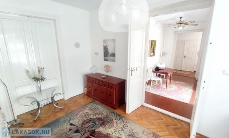Pécs belvárosának szívében, a Király utcában első emeleti, elegáns, 108 nm alapterületű lakás eladó!A négylakásos társasház legnagyobb lakása a színháztól nem messze, a Kazinczy és Lyceum utca között található. Déli tájolású ablakai fás-parkos, nyugodt társasházi belső udvarra nyílnak, utcafronti szobái akár tovább bonthatóak, igy könnyen nappali-konyha-étkező és 3 külön bejáratú szobássá alakítható! A társasházi közös kertből saját használatú kertrésszel rendelkezik. A lakás jó állapotú és elosztású, 3 tágas szobával, és étkező-konyhával. Helyiségei körben 6 nagy, jó kilátású ablakkal rendelkeznek. Étkezővel egybenyitott konyha, nagy gardróbszoba, kamrahelyiség, külön fürdőszoba és WC, saját használatú előtér találhatóak benne. A gardrób beépített kétszintes ruhaállványzattal, a fürdőszoba káddal, az előszoba kétszárnyú beépített szekrénnyel felszereltek. A lakás nemrég festett és mázolt. Alacsony rezsiköltségű, radiátoros központi fűtéses Bosch gázkazánnal. A magánhasználatú, szintén udvari kilátású feljáró-előtér mellett saját, tágas alagsori tárolóhelyiséggel is rendelkezik. Tetőtérbeépítés és a lakás irodai átalakítása is lehetségesek. Klasszikus stílusú bútorai megegyezés tárgya lehetnek. Tehermentes, nem lakott, gyorsan birtokba vehető! Tágas polgári otthonnak, kényelmes irodának vagy a tetőtér beépítésével remek befektetésnek? Bármely célból gondolja, várom érdeklődő hívását!