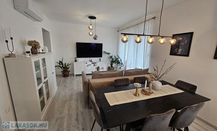 Kertkapcsolat és extra területek. A lakáshoz tartozik egy 240 m²-es kizárólagos használatú, parkosított kert, benne egy könnyűszerkezetes, 10 m²-es kisházzal ideális tárolónak vagy hobbihelyiségnek. Két kényelmes terasz, mindkettő beépített, kinyitható árnyékolóval. A kertből kiskapun keresztül is eljuthatunk a két autóbeállóhoz, melyek közvetlenül a lakás előtt helyezkednek el. Belső elrendezés 3 hálószoba Tágas nappali-konyha-étkező egy légtérben 2 igényes fürdőszobaPrémium felszereltség FAP olasz hidegburkolatok Hansgrohe falba süllyesztett csaptelepek Blanco gránit mosogató és csaptelep a konyhában Minőségi német konyhabútor kompakt munkapulttal, konyhaszigettel Új, elektromos fehér alumínium redőnyök minden ablakon Hőszivattyús padlófűtés + fancoil hűtés a kellemes klímáért egész évben Alacsony rezsiköltségek, energiahatékony, és letisztult, igényes belső terek.