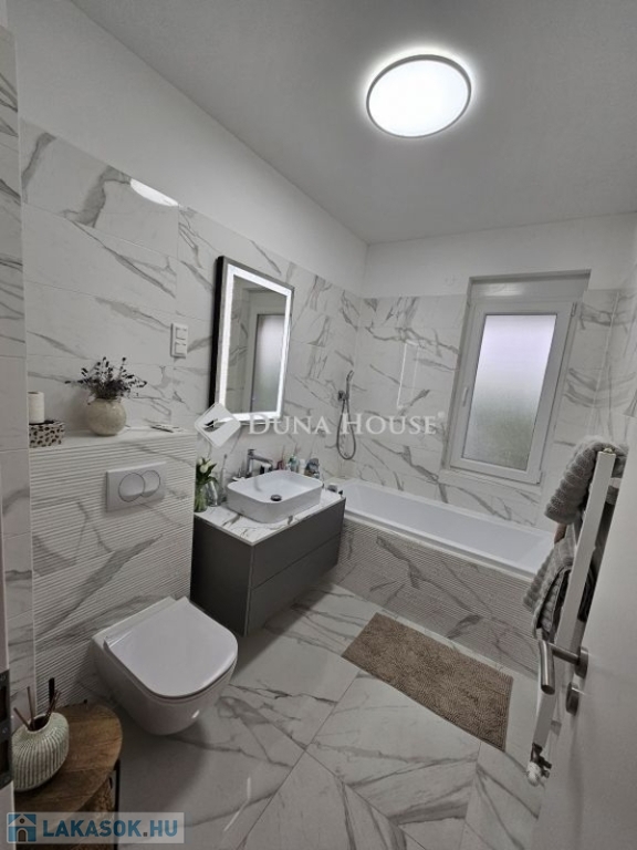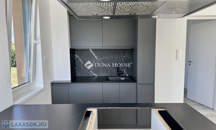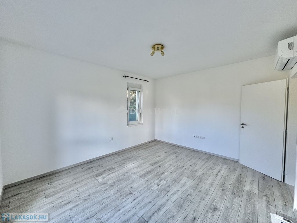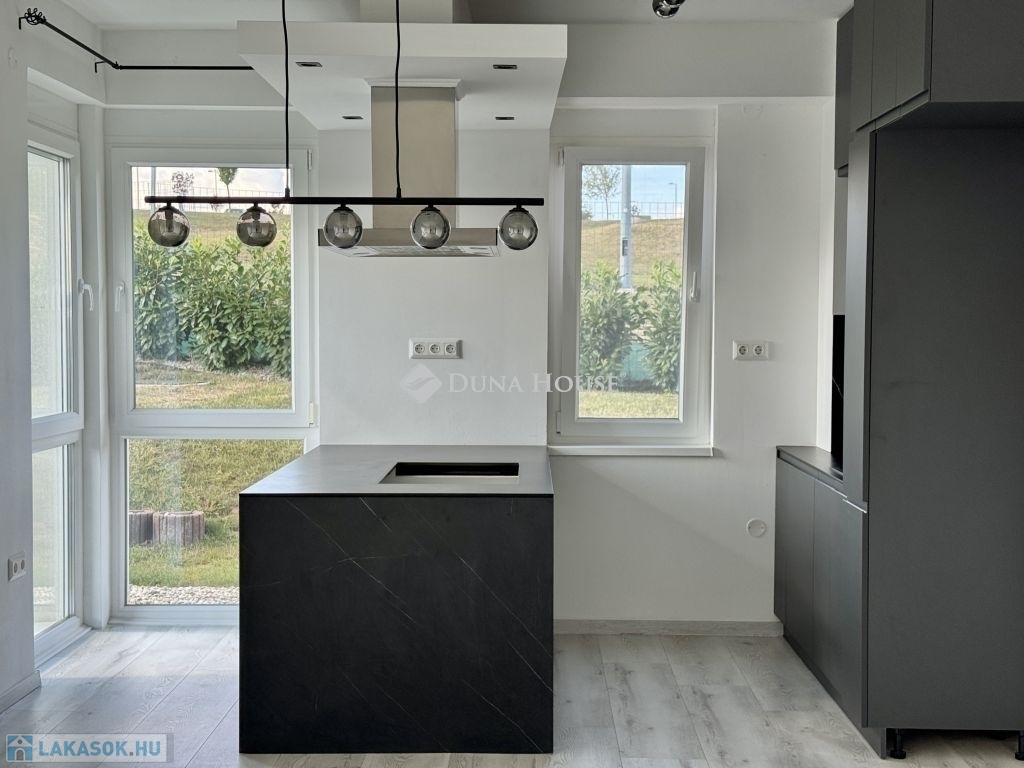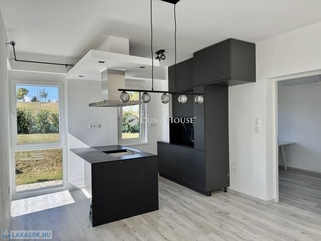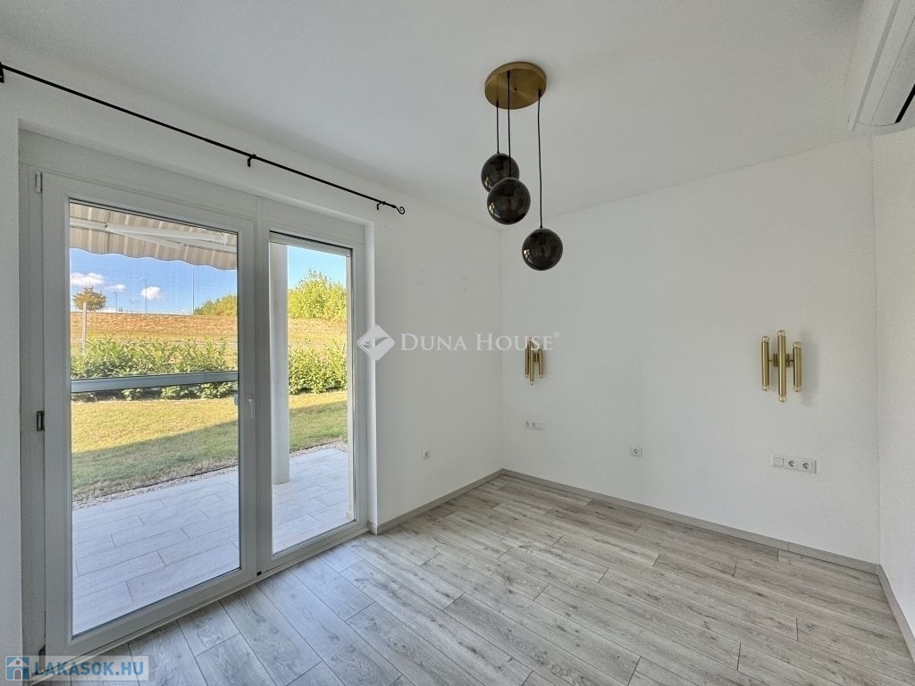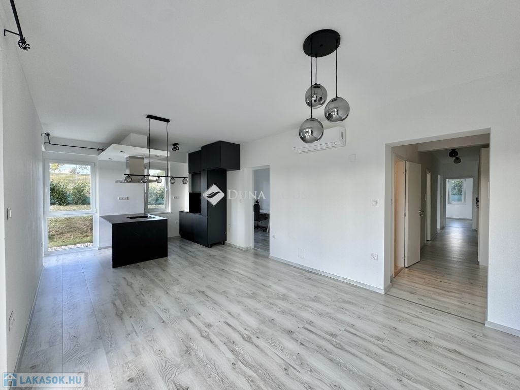 Eladó újszerű kertvárosi lakás, saját parkosított kertkapcsolattal!!!!!Pécs egyik csendes, zöldövezeti részén kínálunk megvételre egy 2023-ban átadott 92 m²-es földszinti lakást, amely minden igényt kielégítő belső kialakítással és kivételes külső adottságokkal rendelkezik.Kertkapcsolat és extra területekA lakáshoz tartozik egy 240 m²-es kizárólagos használatú, parkosított kert, benne egy könnyűszerkezetes, 10 m²-es kisházzal ideális tárolónak vagy hobbihelyiségnek.Két kényelmes terasz, mindkettő beépített, kinyitható árnyékolóval.Belső elrendezés 3 hálószoba Tágas nappali-konyha-étkező egy légtérben 2 igényes fürdőszobaPrémium felszereltség FAP olasz hidegburkolatok Hansgrohe falba süllyesztett csaptelepek Blanco gránit mosogató és csaptelep a konyhában Minőségi német konyhabútor kompakt munkapulttal, konyhaszigettel Új, elektromos fehér alumínium redőnyök minden ablakon Hőszivattyús padlófűtés + fancoil hűtés a kellemes klímáért egész évben Alacsony rezsiköltségek, energiahatékony, és letisztult, igényes belső terek.Elhelyezkedés szempontjából is ideális:A belváros autóval mindössze 7 perc, de a tömegközlekedés is kiváló. A mindennapi ügyintézéshez szükséges szolgáltatások csupán egy percre találhatók: Tesco, Rossmann, gyógyszertár, minden gyalogosan is gyorsan elérhető.