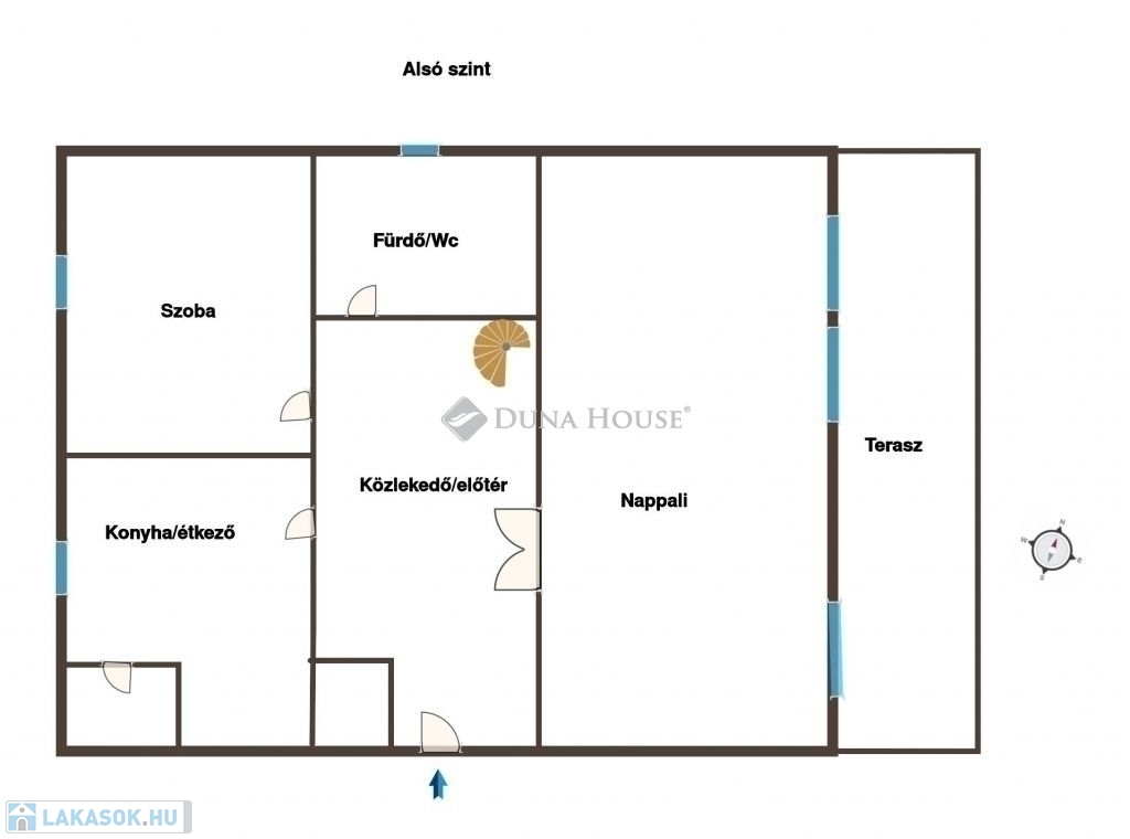 Az alsó szinten egy napfényben bővelkedő, tágas nappali kapott helyet, amely közvetlen kijárattal rendelkezik a nagy méretű, örökpanorámás teraszra. Itt található továbbá egy külön hálószoba, egy szeparált konyha, valamint egy fürdőszoba zuhanykabinnal.