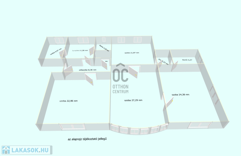 Helyiségek: 4 egész szoba, 1 félszoba, előszoba, konyha, fürdőszoba+wc, külön wc, kamra