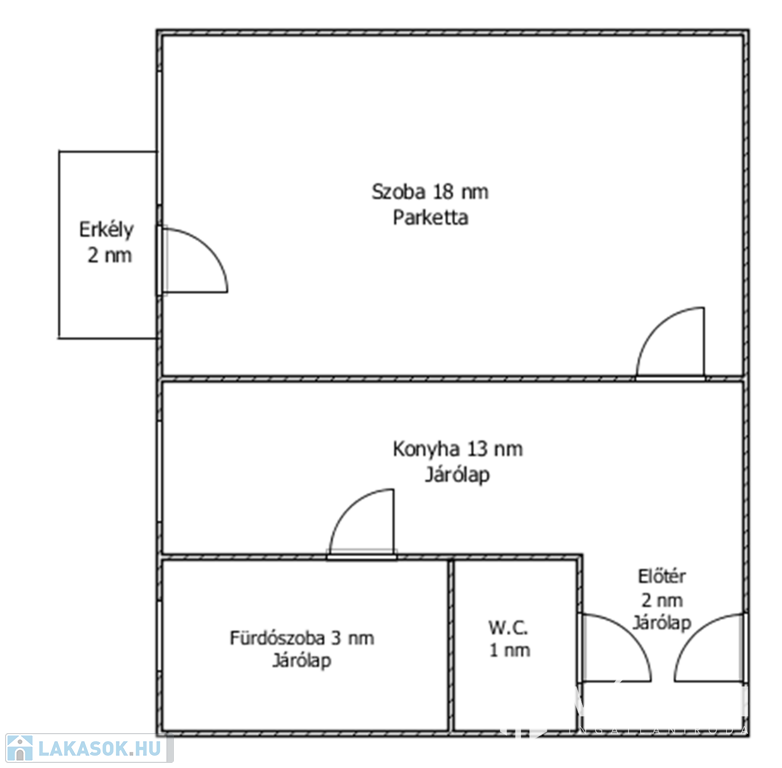 Helyiségei: 1 szoba, konyha-étkező, fürdőszoba, külön nyíló W.C., előszoba, erkély.