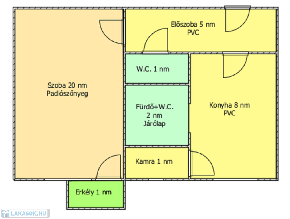 Helyiségei: 1 szoba, konyha, kamra, előszoba, fürdőszoba, külön nyíló W.C., erkély.