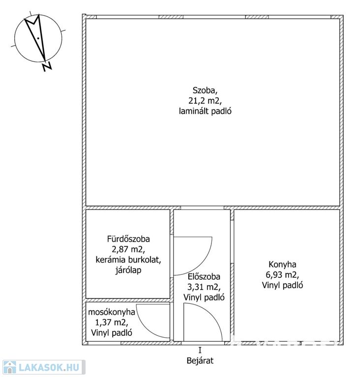 A szoba padlóburkolata laminált padló, a konyha, a mosókonyha és a bejárat vinyl burkolatot kapott, a fürdőszoba csúszásmentes, a falburkolattal azonos színű, járólapos burkolású.
