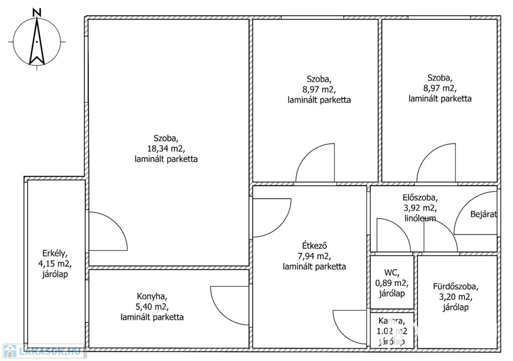 Salgótarjánban eladó egy 63 négyzetméteres, részben felújított, háromszobás, erkélyes lakás. A szobák, az étkező és a konyha laminált padlóval, a fürdőszoba, a WC és az erkély járólappal burkolt. A lakás elosztása praktikus, a konyha mellett külön étkező is található, ezen kívül egy nagy és két kisebb szobával is rendelkezik. A fürdőszoba és a WC külön helyiségben került kialakításra. A nagy erkély redőnyözött, így a nyári melegtől és a téli hidegtől egyaránt védi a lakás többi részét, ugyanakkor kellemes tartózkodási helyet biztosít a szabad levegőn, anélkül, hogy ki kellene menni a lakásból. A szobák ablakai is redőnyözöttek. A bejárati ajtó új, esztétikus kivitelű biztonsági ajtó. A lakás független főmérős vízórával rendelkezik. A fűtése egyedi központifűtés, cirkulációs gázkazánnal, melegvíz biztosítása elektromos fűtésű bojlerrel van megoldva. A lépcsőház minden szintjén van egy-egy közös tároló, amely az emeleten lévő négy lakáshoz tartozik. A lépcsőház tiszta rendezett, rendszeresen takarított. A bejárat kaputelefonos beléptetőrendszerrel védett. Parkolni az utcán díjmentesen lehet. A helyijárati buszmegálló kevesebb, mint kétszáz méterre van a háztól. A közelben van orvosi rendelő, óvoda, iskola, gyógyszertár, továbbá TESCO, LIDL, és Spar üzlet is.