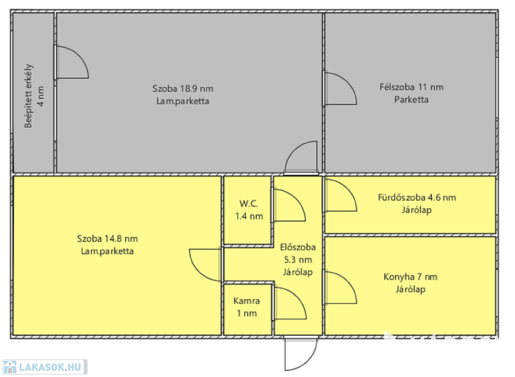 Helyiségei: 2 szoba, 1 szoba, konyha, kamra, előszoba, fürdőszoba, külön nyíló W.C., beépített erkély.