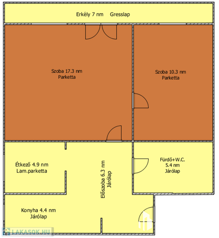 Helyiségei: 1 szoba, 1 félszoba, konyha, étkező, előszoba, fürdőszoba, erkély.