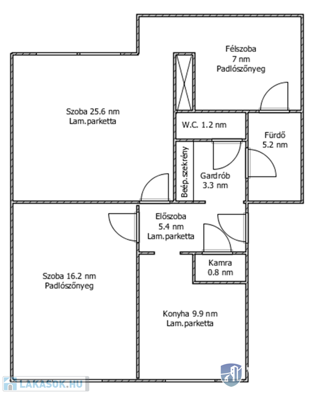 Helyiségei: 2 külön nyíló szoba, 1 félszoba, konyha, kamra, gardrób, fürdőszoba, külön nyíló W.C., előszoba.