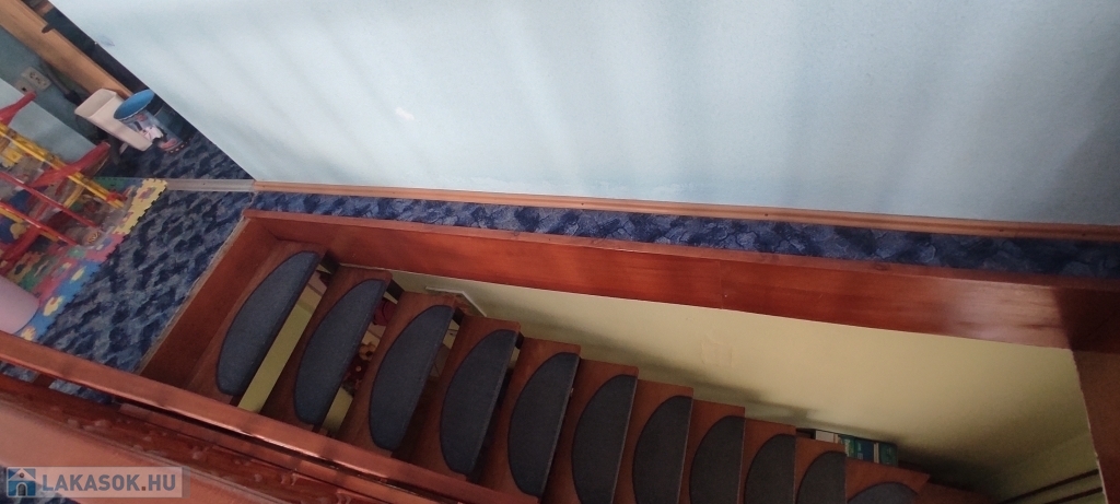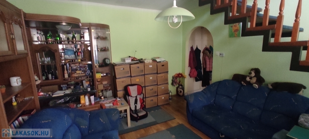 A lakás bejárata a magasföldszinten van, a felső szintre az alsó nappaliból nyíló lépcsőn lehet felmenni.