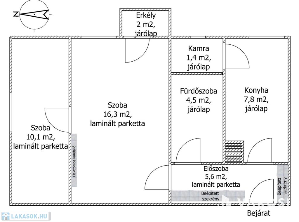 A padlóburkolatok laminált parkettás, és járólapos kivitelűek.