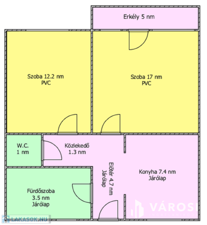 Helyiségei: 2 szoba, konyha, előszoba, közlekedő, fürdőszoba, külön nyíló W.C., erkély.