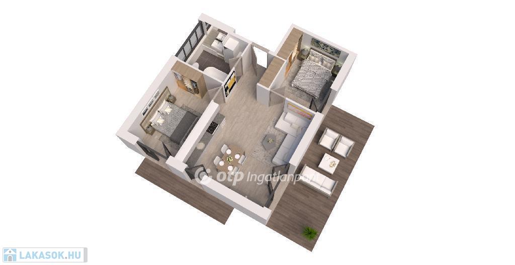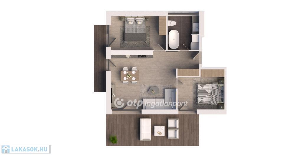 Helyiségek: nappali + 2 hálószoba, fürdőszoba, konyha-és étkező.