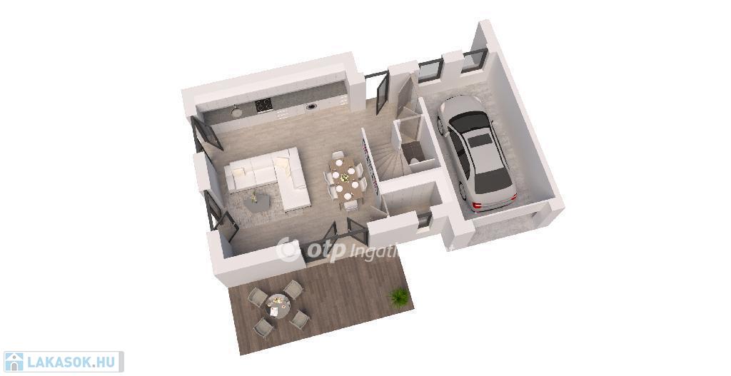 A földszinten található a tágas nappali, a garázs és egy 16,23 nm terasz, amely közvetlen kertkapcsolattal rendelkezik. Az emeleten kapott helyet a két hálószoba, két fürdőszoba és két különálló terasz(4,26 és 18,42 nm), amelyek biztosítják a kellemes pihenést.